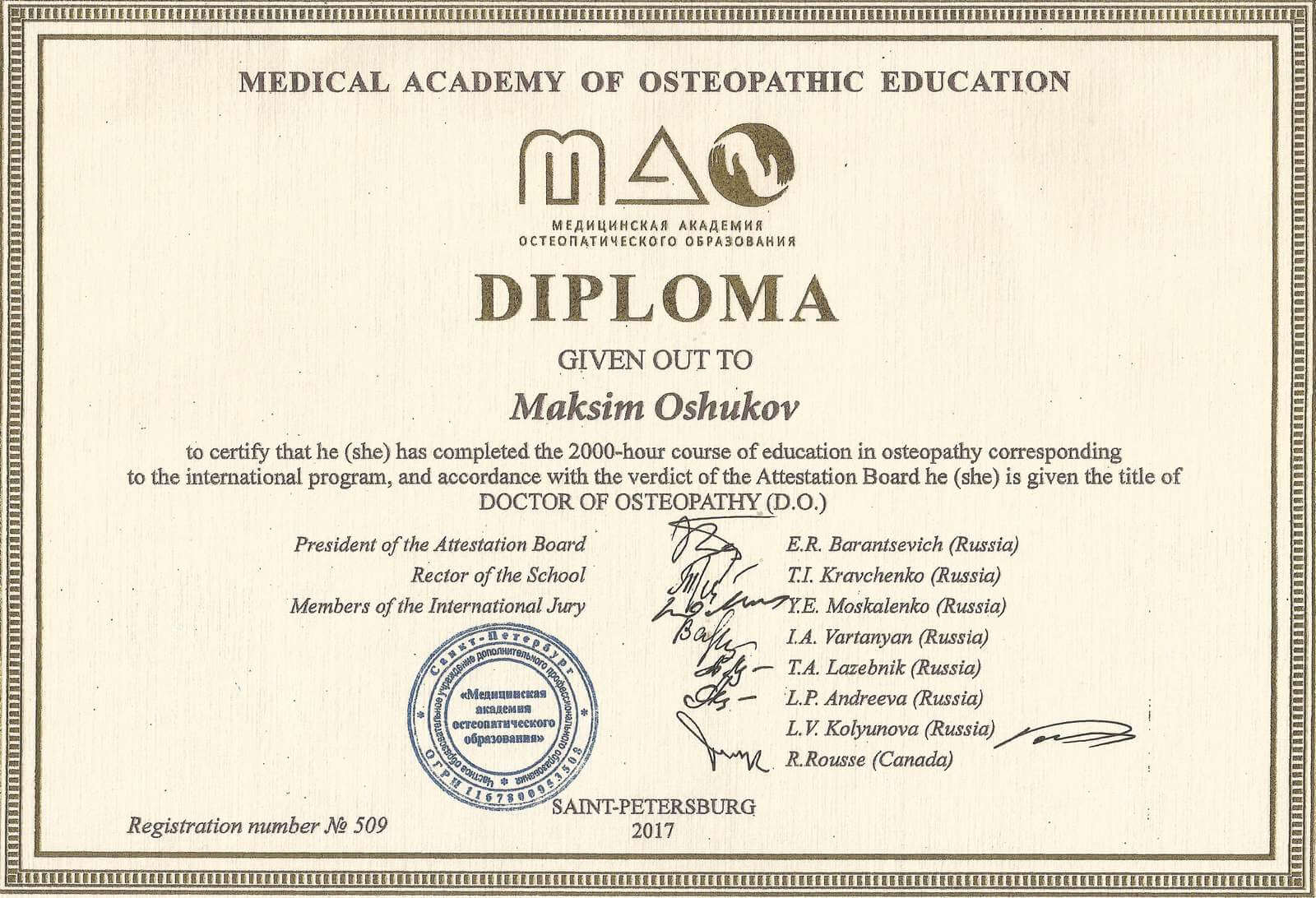 2017 - получено звание Доктор остеопатии, Медицинская академия остеопатического образования, г.Санкт-Петербург