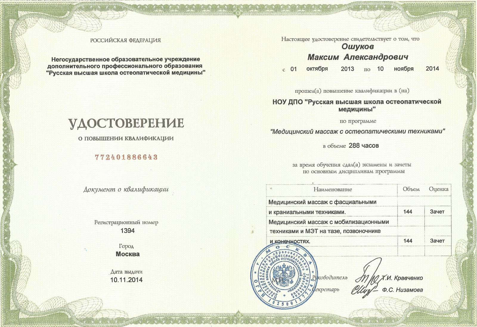 2013 - 2017 - повышение квалификации Русская высшая школа остеопатической медицины "Медицинский массаж с остеопатическими техниками":