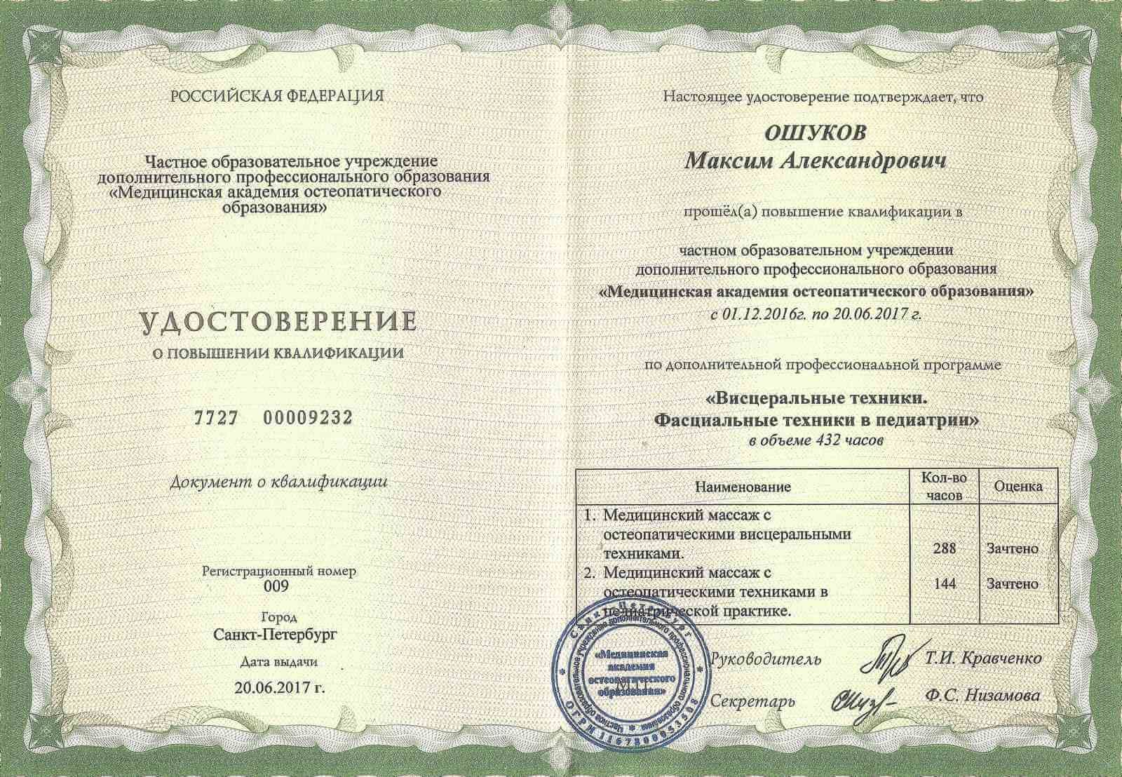 2016 - 2017 - повышение квалификации Медицинская Академия Остеопатического образования "Висцеральные техники. Фасциальные техники в педиатрии"
