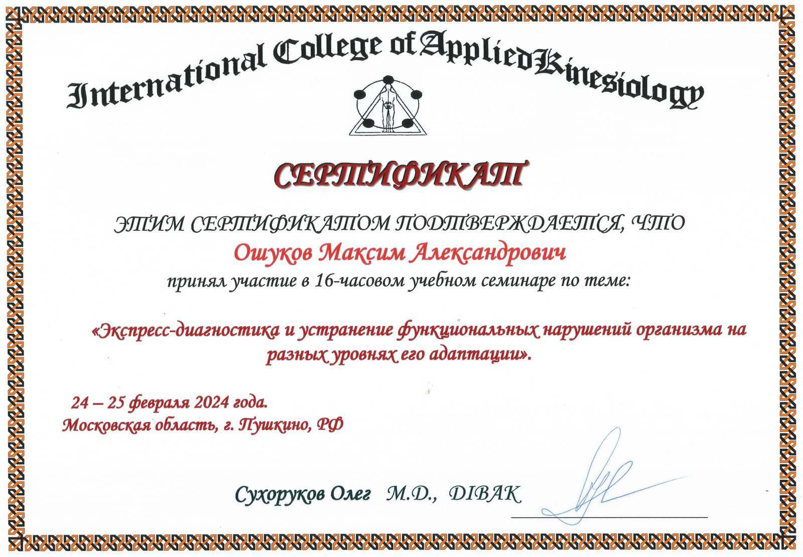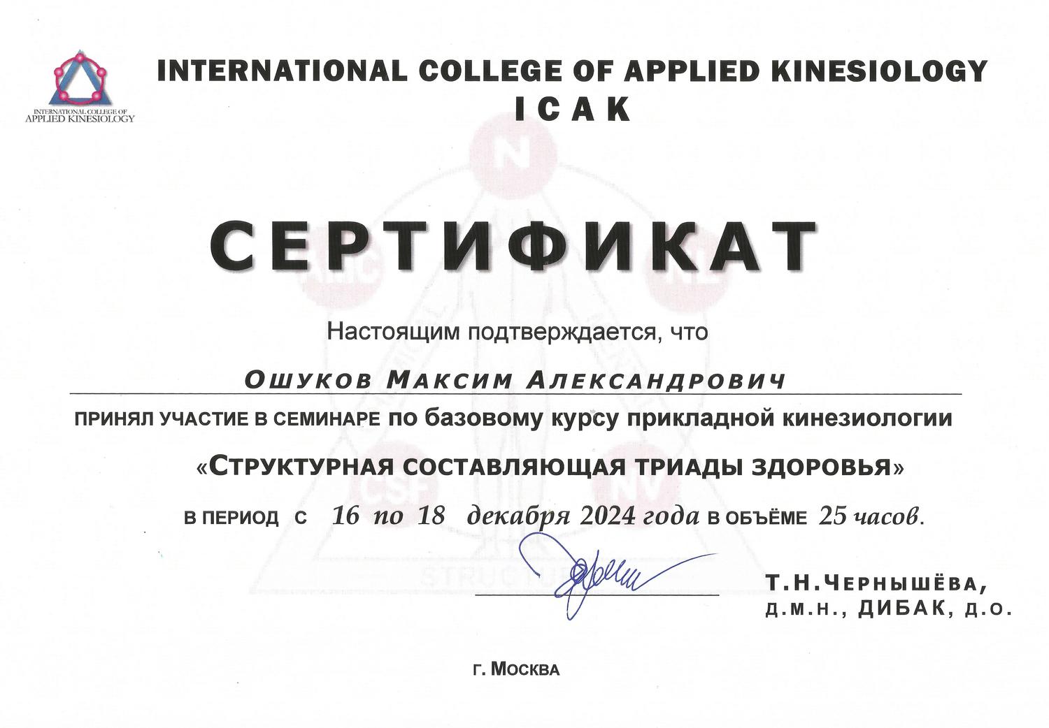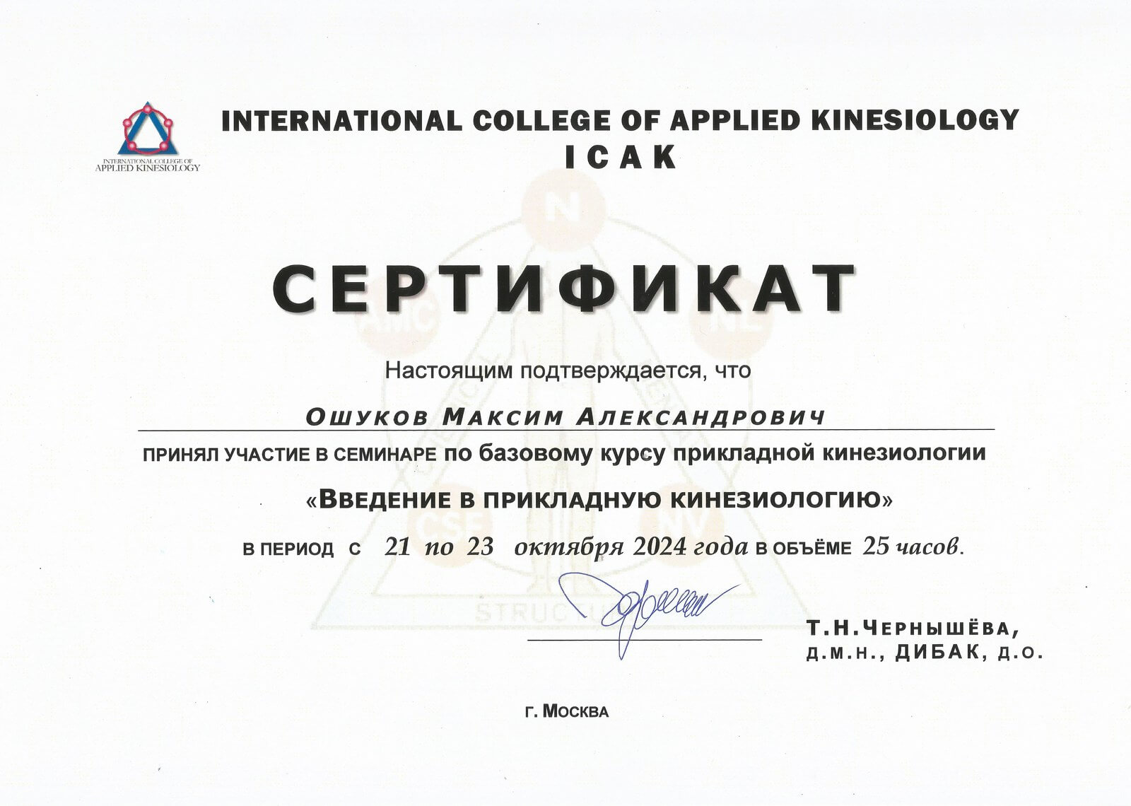 2024 - International College of Applied Kinesiology семинар "Экспресс-диагностика и устранение функциональных нарушений организма на разных уровнях его адаптации"