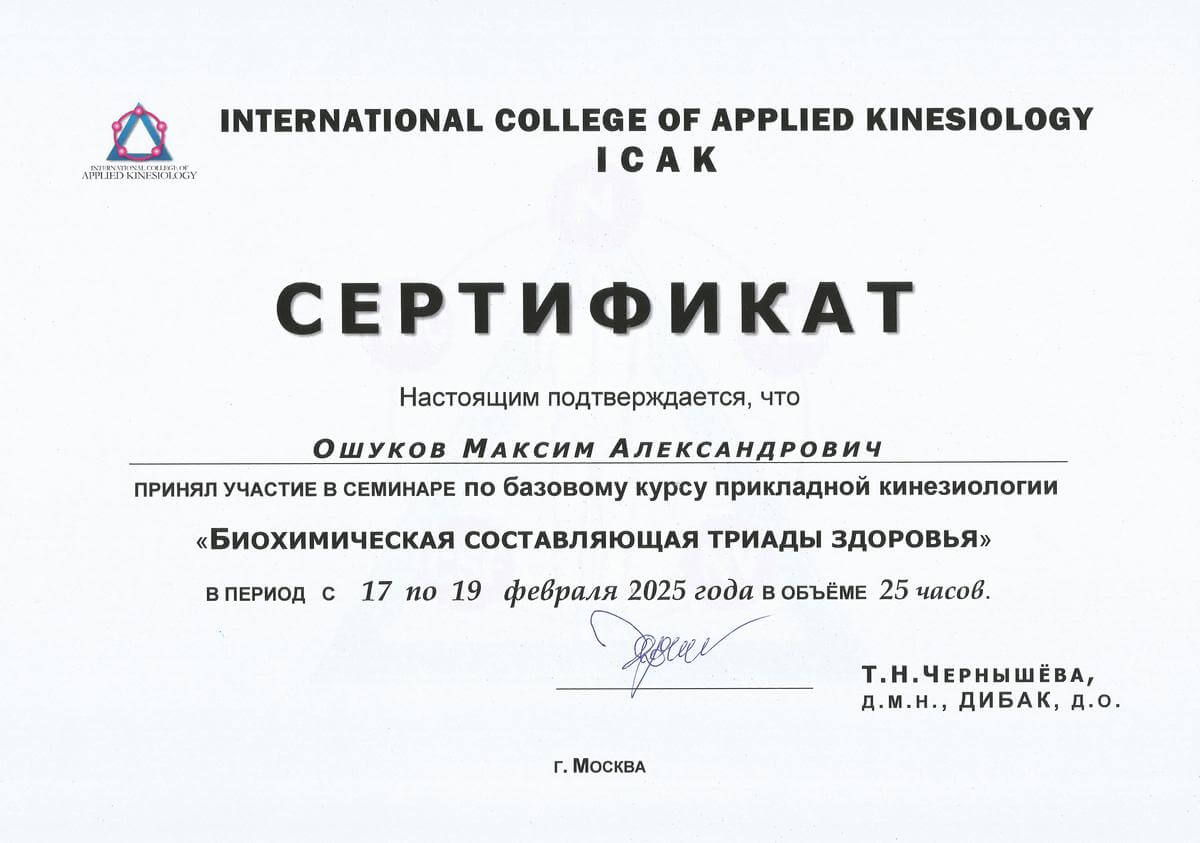 2025 - International College of Applied Kinesiology (ICAK) семинар по базовому курсу прикладной кинезиологии "Биохимическая составляющая триады здоровья"