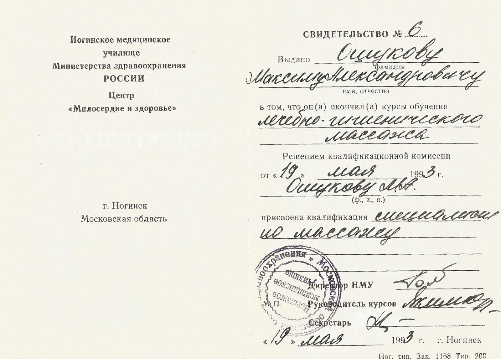 1993 - Ногинское медицинское училище по специальности "Медицинский массаж"