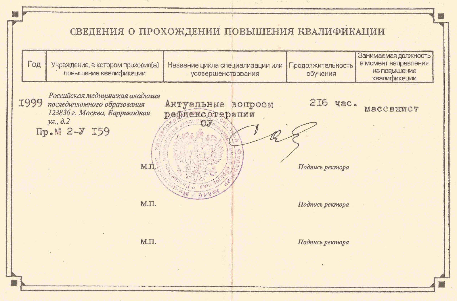 1999 - повышение квалификации Российская Медицинская Академия последипломного образования «Актуальные вопросы рефлексотерапии»