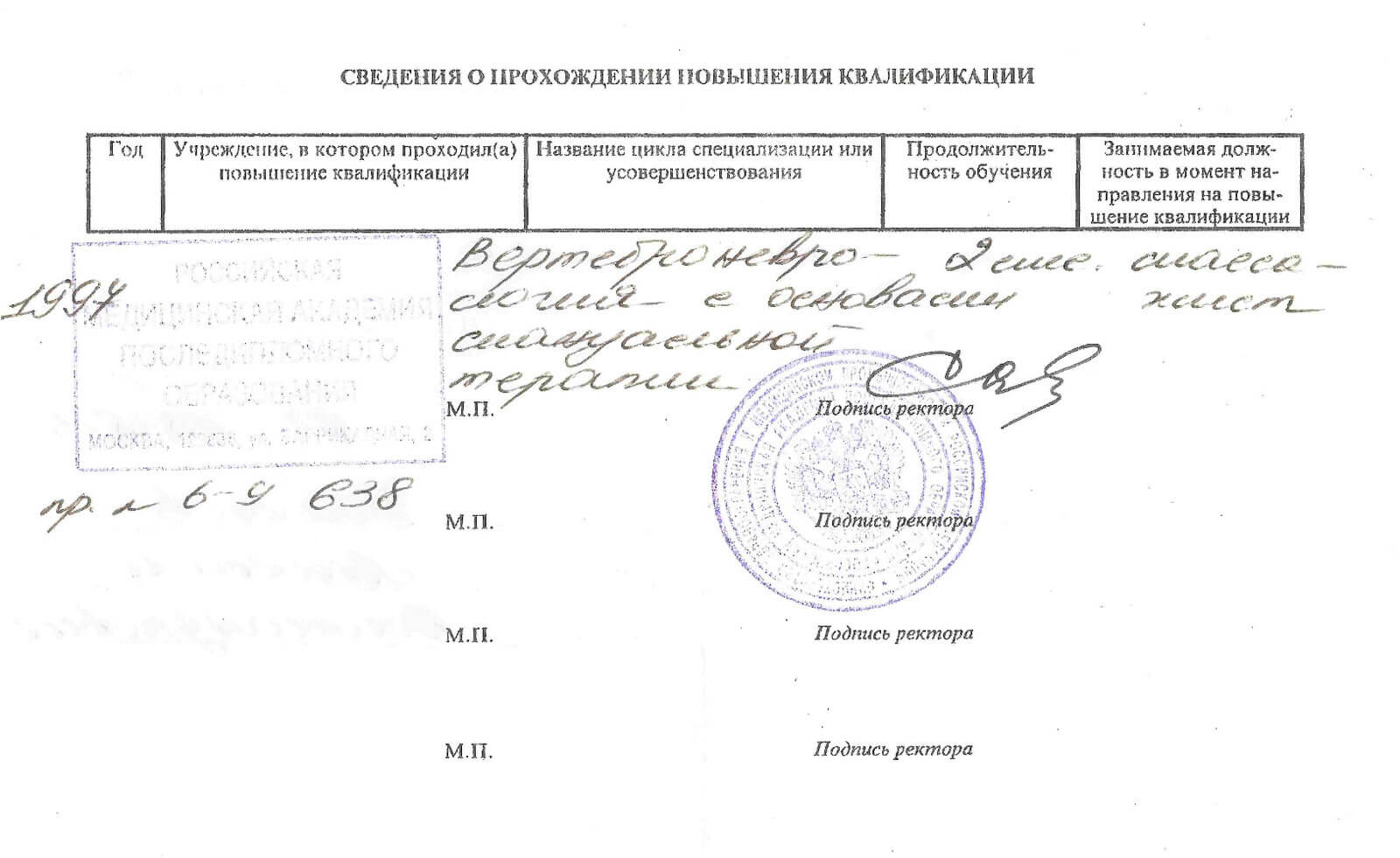 1997 - повышение квалификации Российская Медицинская Академия последипломного образования «Вертеброневрология с основами мануальной терапии»