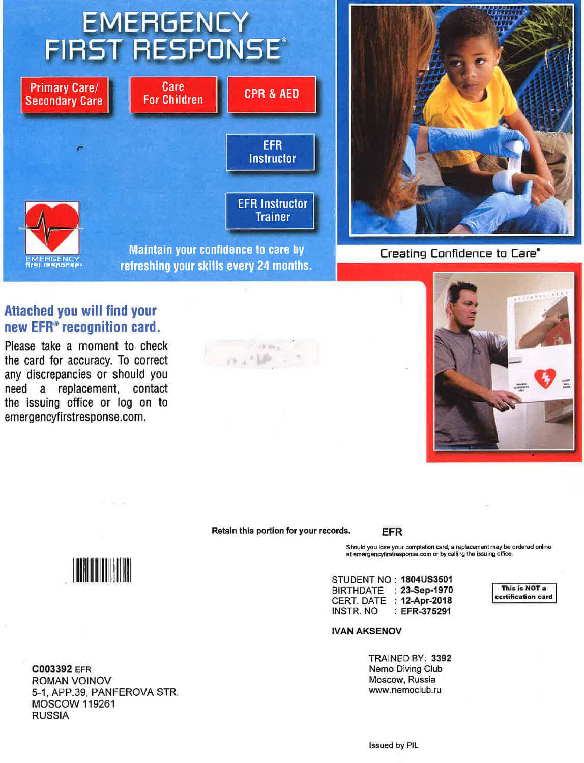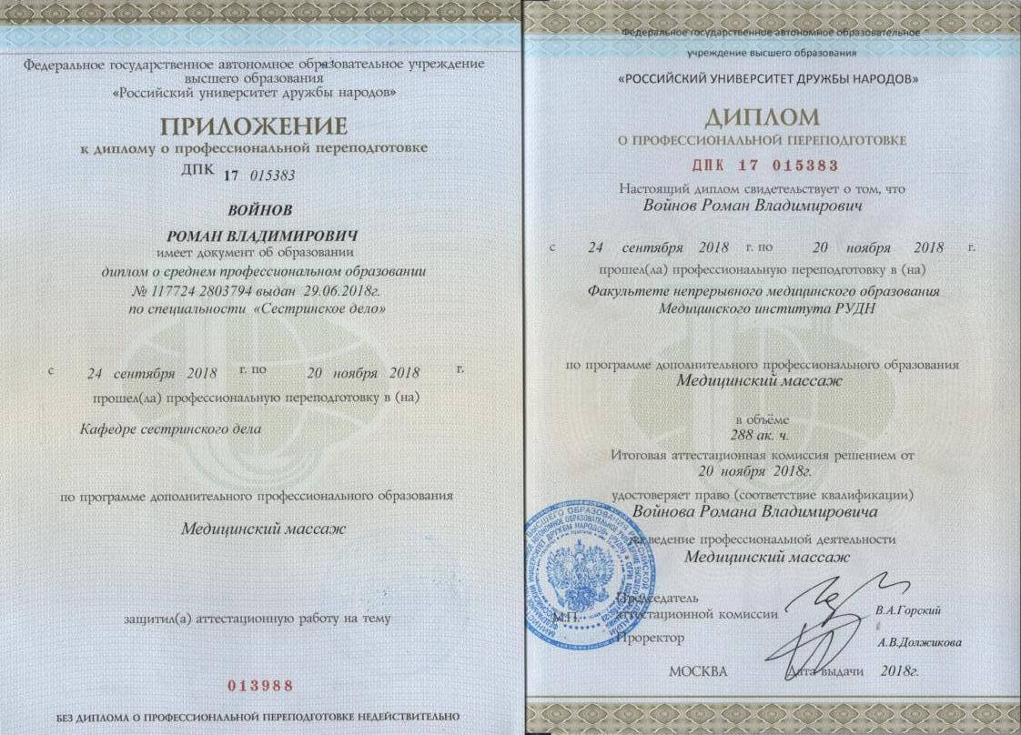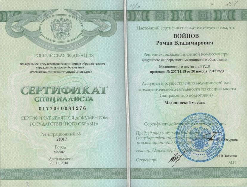 2018 – ФГАОУ ВО «Российский университет дружбы народов» (г. Москва): сертификат на осуществление медицинской деятельности по специальности «Медицинский массаж»