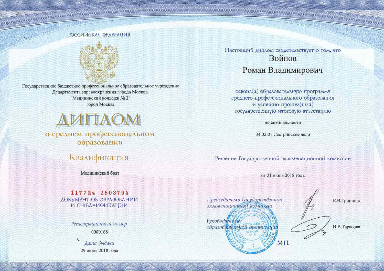 2018 – ГБПОУ «Медицинский колледж №2» (г. Москва): квалификация – Медицинский брат