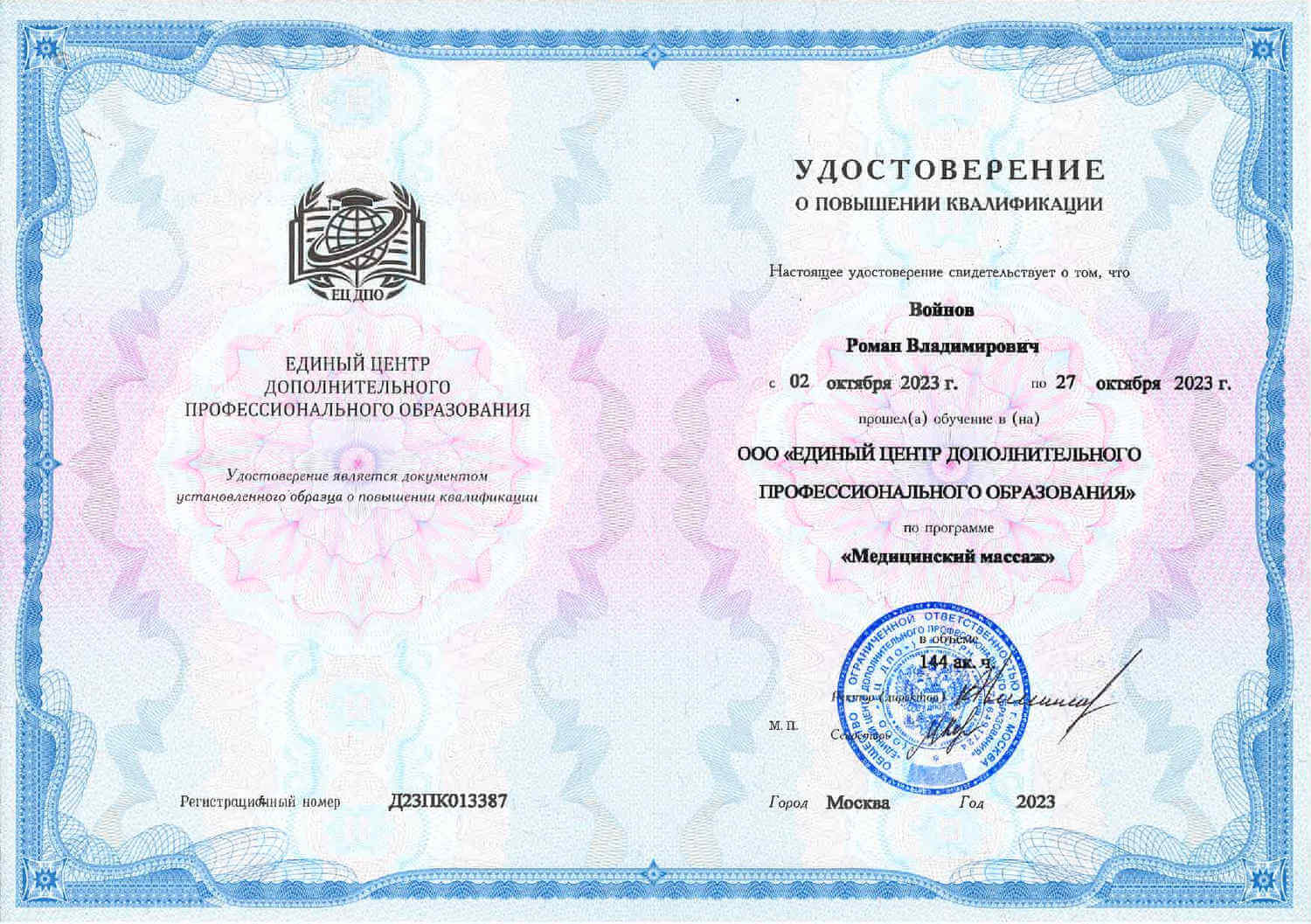 2023 – Единый центр дополнительного профессионального образования (г. Москва): повышение квалификации по программе «Медицинский массаж»