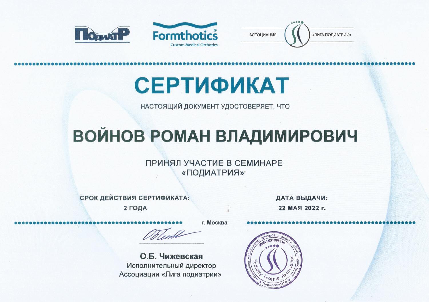 2022 – сертификат участника семинара "Подиатрия" Ассоциации «Лига подиатрии»