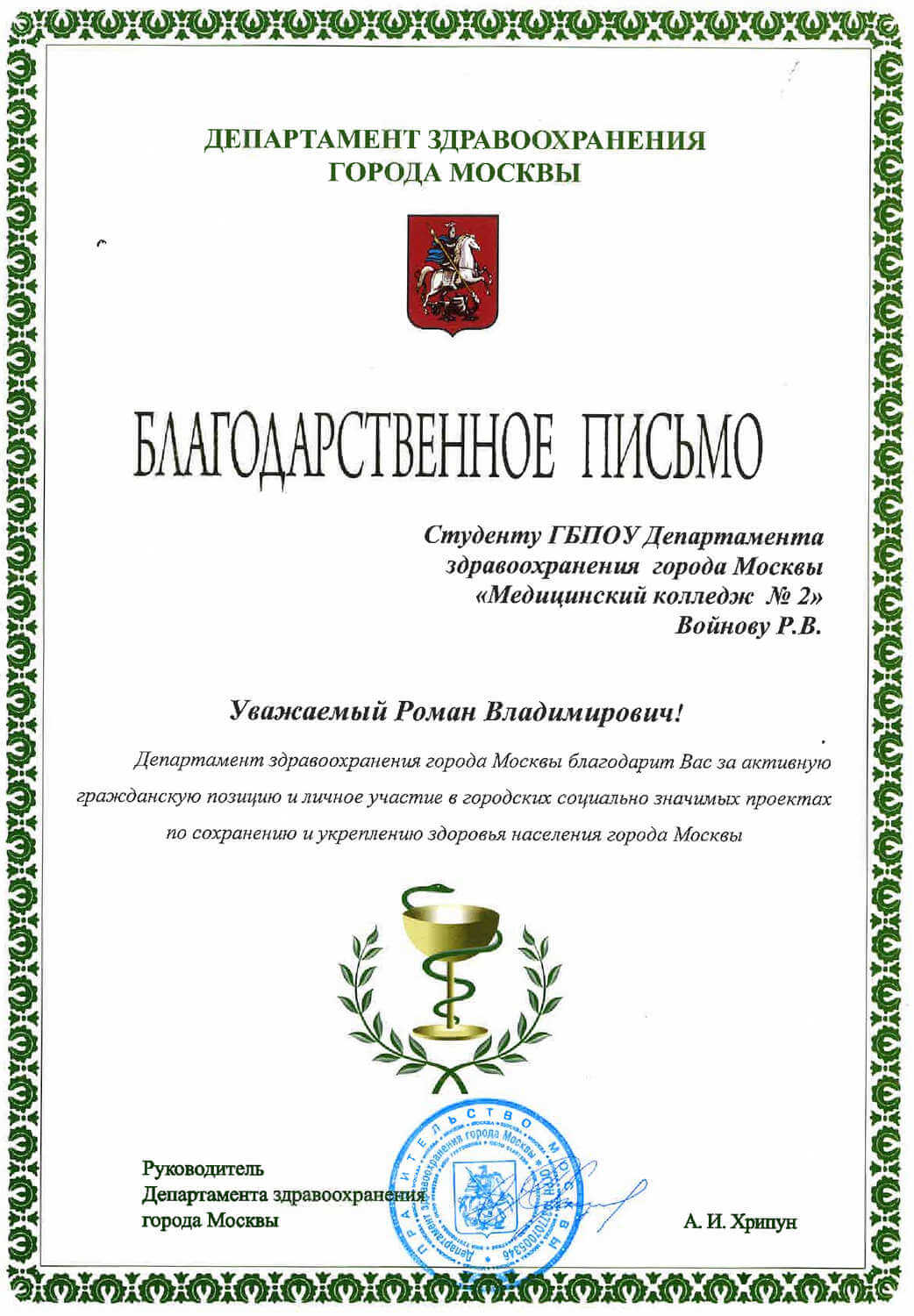 Благодарности: Благодарственное письмо Департамента здравоохранения города Москвы за активную гражданскую позицию и личное участие в городских социально-значимых проектах по сохранению и укреплению здоровья населения города Москвы.