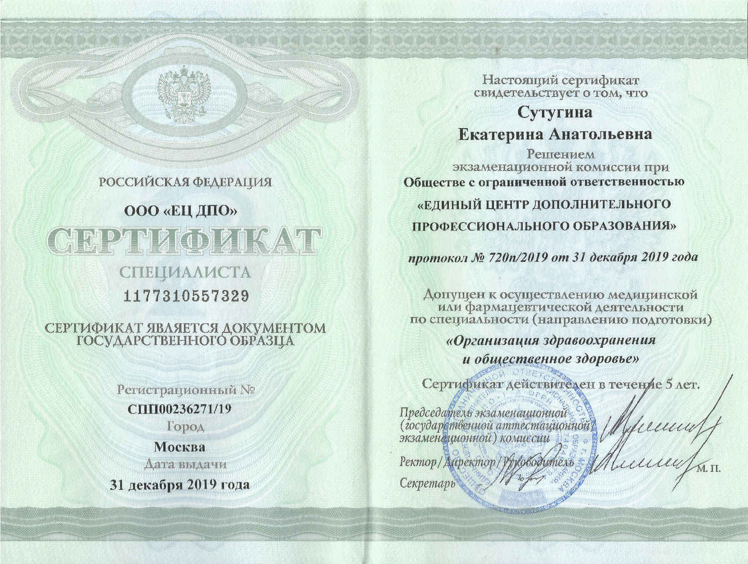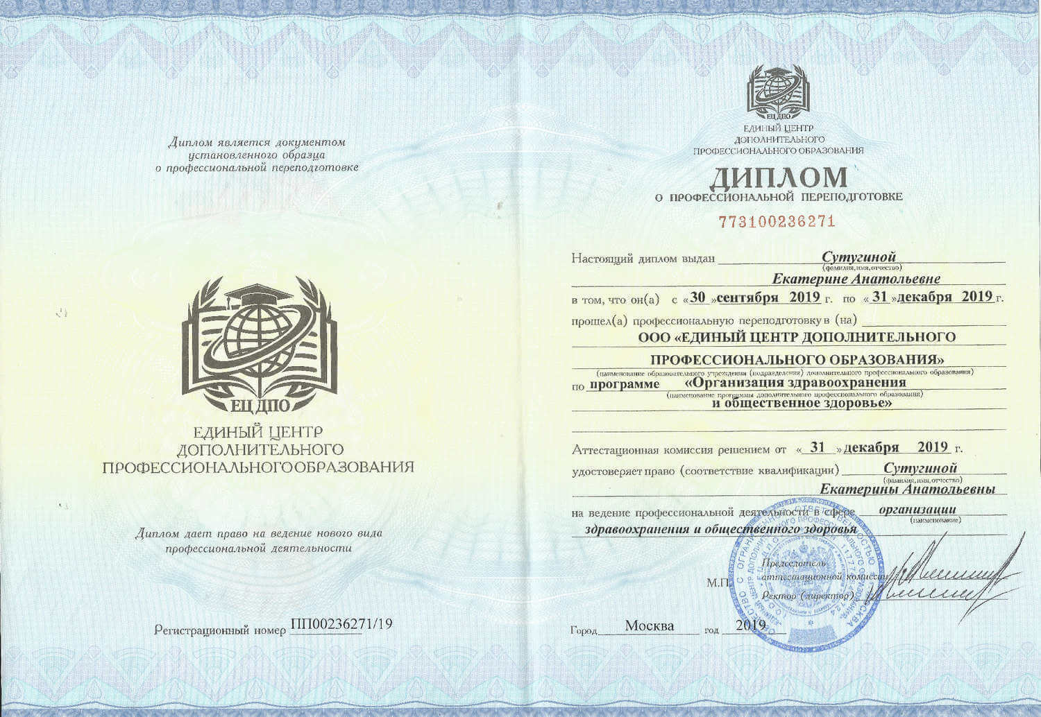 2019 - профессиональная переподготовка по специальности «Организация здравоохранения и общественное здоровье»