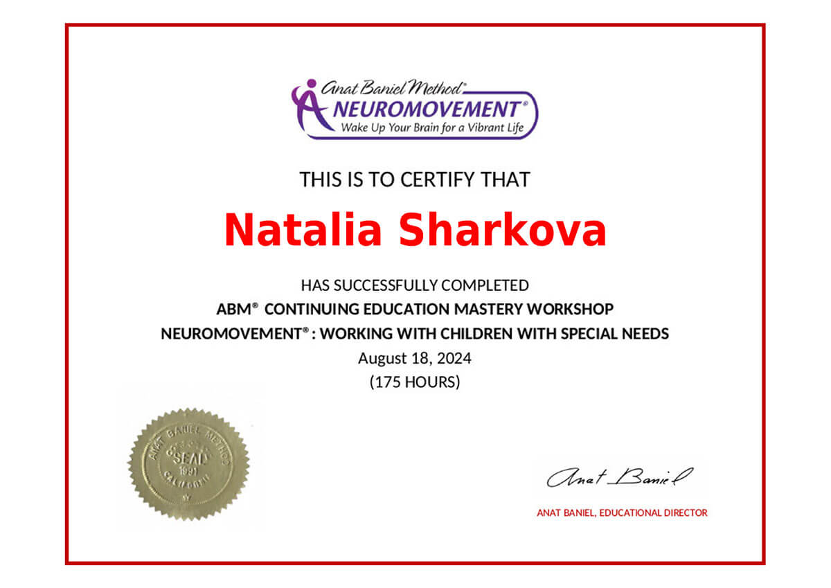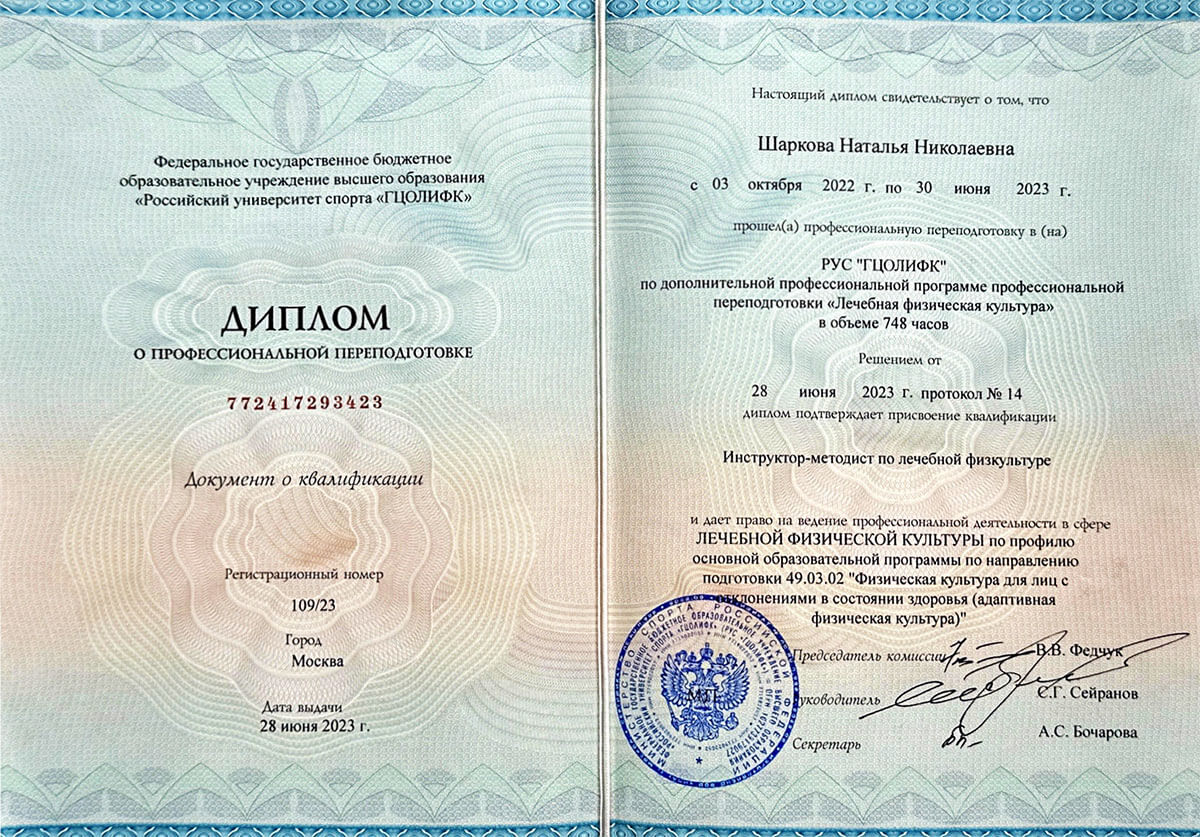 2022 – окончила РГУФКСиТ, кафедра физической реабилитации, специальность - инструктор-методист по лечебной физической культуре
